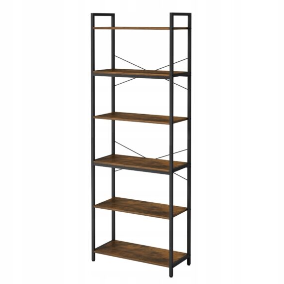 Das Bücherregal besticht durch seine Kombination aus natürlichen, hellbraunen Holztönen mit gealtertem Finish und einem massiven, mattschwarzen Metallrahmen. Das offene Design mit gekreuzten Stützen an der Rückseite sorgt für ein stilvolles, loftartiges Gefühl und bietet gleichzeitig Stabilität.