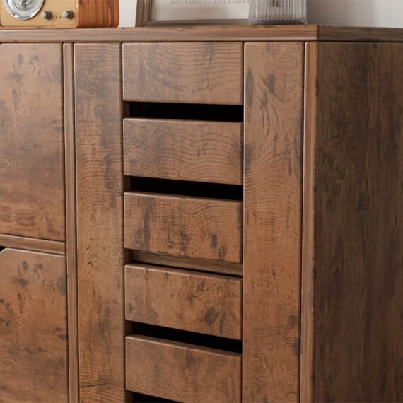 - Die Kastenfronten auf der rechten Seite mit Lattenrost verleihen der Kommode einen modernen Look und ermöglichen einen einfachen Zugriff auf die gelagerten Gegenstände.